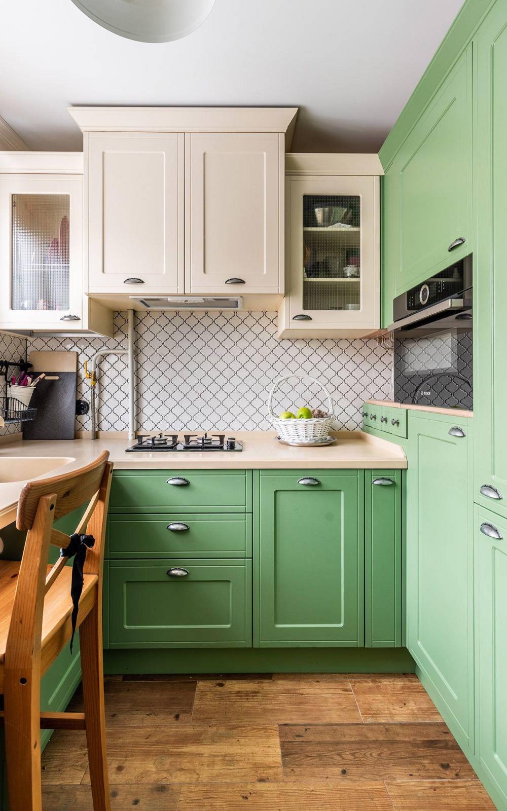 Пол. Его чаще всего выкладывают плиткой, покрывают ламинатом или линолеумом с имитацией текстуры дерева. В кухнях оливкового цвета действует правило: светлый потолок и пол более темного оттенка, как на фото ниже. При выборе цвета напольного покрытия для кухни следует ориентироваться на один из оттенков, использованных в ее оформлении. Например, пол может сочетаться по цвету с более светлой столешницей, с фартуком или, как на нашем фото, со стульями.